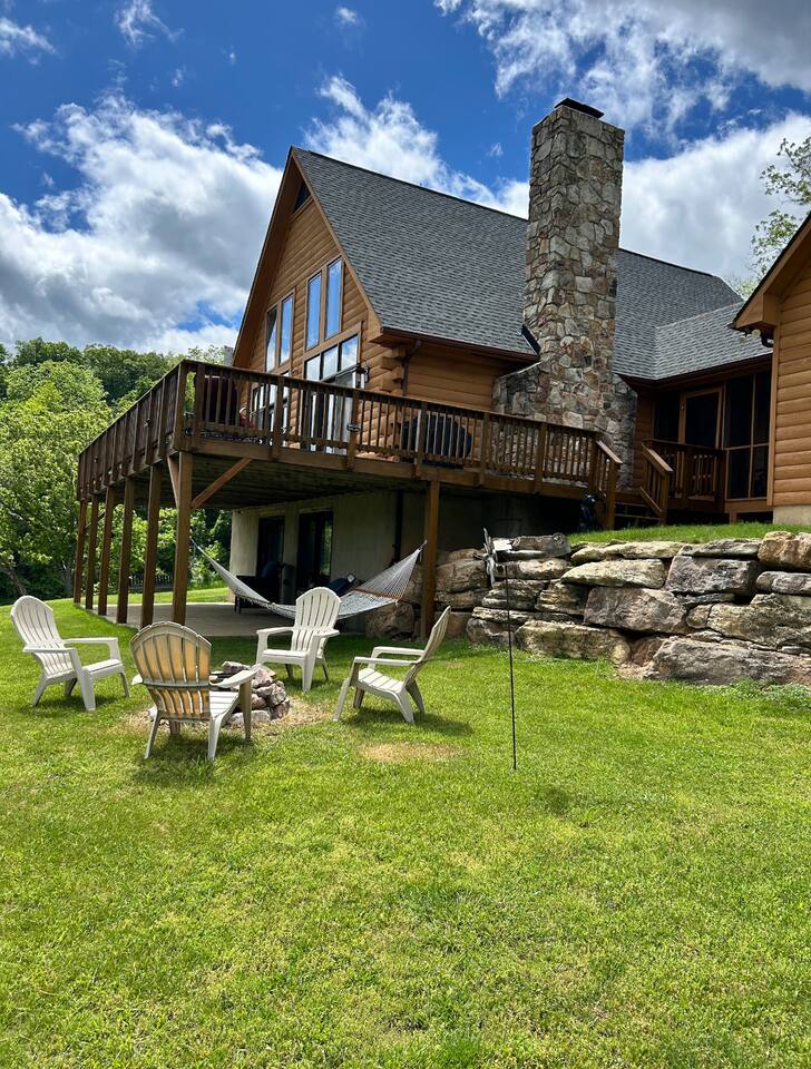 Your group will LOVE the serene views from this hilltop cabin! •Less than 1 mile to famous Cascades Golf Course •Cathedral ceiling, wood fireplace, porch swing, hammock, fire pit, grill, wifi •Stocked pond for catch & release fishing •Wildlife sightings, peaceful, fresh air away from the hustle & bustle •2 living areas w/ satellite TV, screened porch •Only 8 min to Omni Homestead, 15 min to natural warm springs •20 min to horseback riding, 25 min to Lake Moomaw •40 min to Douthat State Park